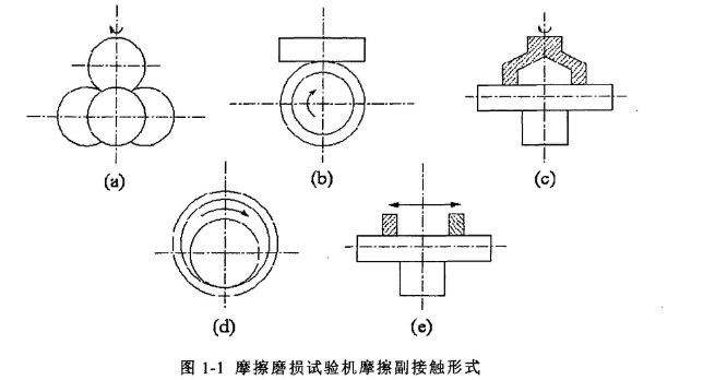 常見的摩擦磨損試驗機摩擦副接觸運動方式在下圖中列出,其中a.圖所示的是四球摩擦磨損試驗機的摩擦副接觸方式。上球卡在一個專用彈性夾頭內(nèi),下面三個球固定并加以載荷,此種方式下設(shè)備試樣接觸形式是典型的點接觸,可以通過測量摩擦力和接觸磨斑直徑的變化來評定潤滑劑的承載能力。b.圖所示的是環(huán)塊試驗機摩擦副接觸方式,此種方式下接觸形式為線接觸,通過測量上試樣摩擦力大小和磨痕的寬度來評定上試樣摩擦磨損性能。c.圖所示為端面摩擦磨損試驗機的摩擦副接觸方式。主要采用面接觸形式,上試樣加工呈環(huán)形端面,下試樣為待測樣品。特別適合于在油潤滑和干摩擦條件下,對式樣的摩擦磨損性能進(jìn)行試驗檢測。d.圖所示為PV摩擦磨損試驗機的摩擦副接觸方式,主要用來測定軸承合理的配合間隙和PV值。e.圖所示為往復(fù)摩擦磨損試驗機摩擦副接觸方式,上試樣下試樣均加工成塊狀,上試樣以一定額率在下試樣表面做往復(fù)運動,以此來評定下試樣的摩擦磨損性能。目前,已有許多新型的多功能摩擦磨損試驗機,他們具有多種試件接觸和運動形式,只要更換試件加劇模塊,就可以完成多種不同類型的實驗和組合實驗。