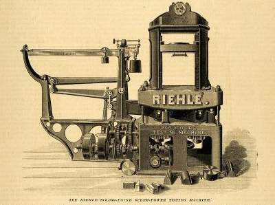 在中國,杠桿式拉伸試驗機(jī)被引進(jìn)大概是在上世紀(jì)初,同濟(jì)大學(xué)建設(shè)初期,引進(jìn)一臺同濟(jì)編號為:440001的杠桿式拉伸試驗機(jī)(圖二),目前,存放于同濟(jì)大學(xué)力學(xué)試驗中心。這臺試驗機(jī)上同時標(biāo)有“RIEHLE BRCXPHILA16494”(圖三)的小字,通過檢索,發(fā)現(xiàn)這臺試驗機(jī)是由位于美國費(fèi)城的理勒兄弟測試機(jī)械公司(Riehle Brothers Testing machines Company)生產(chǎn)。